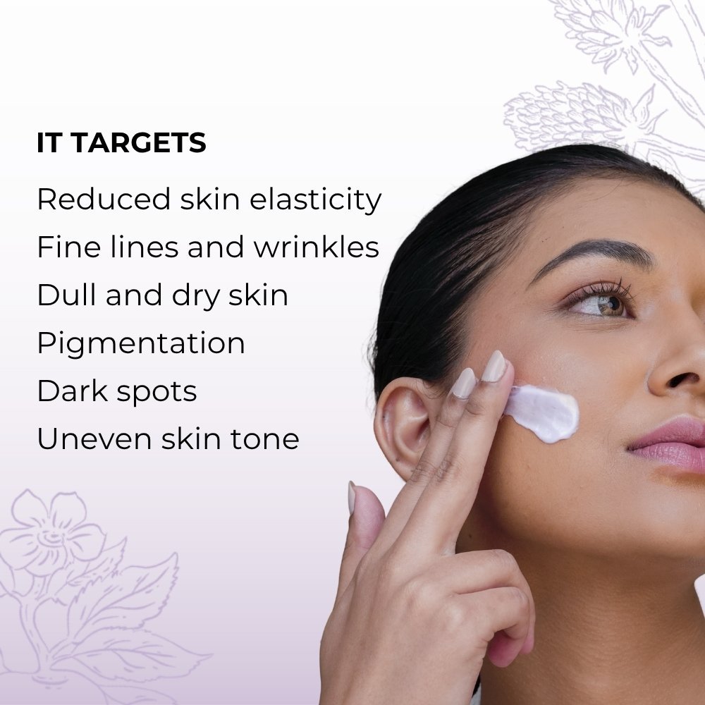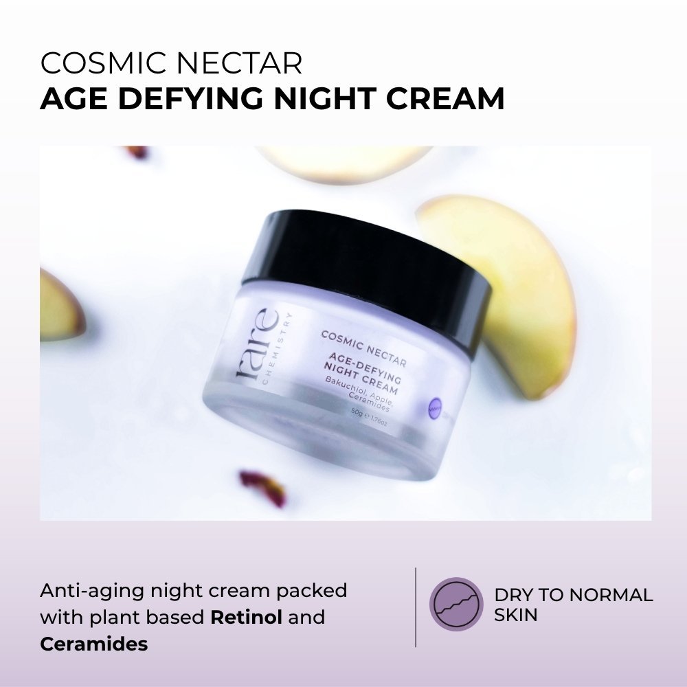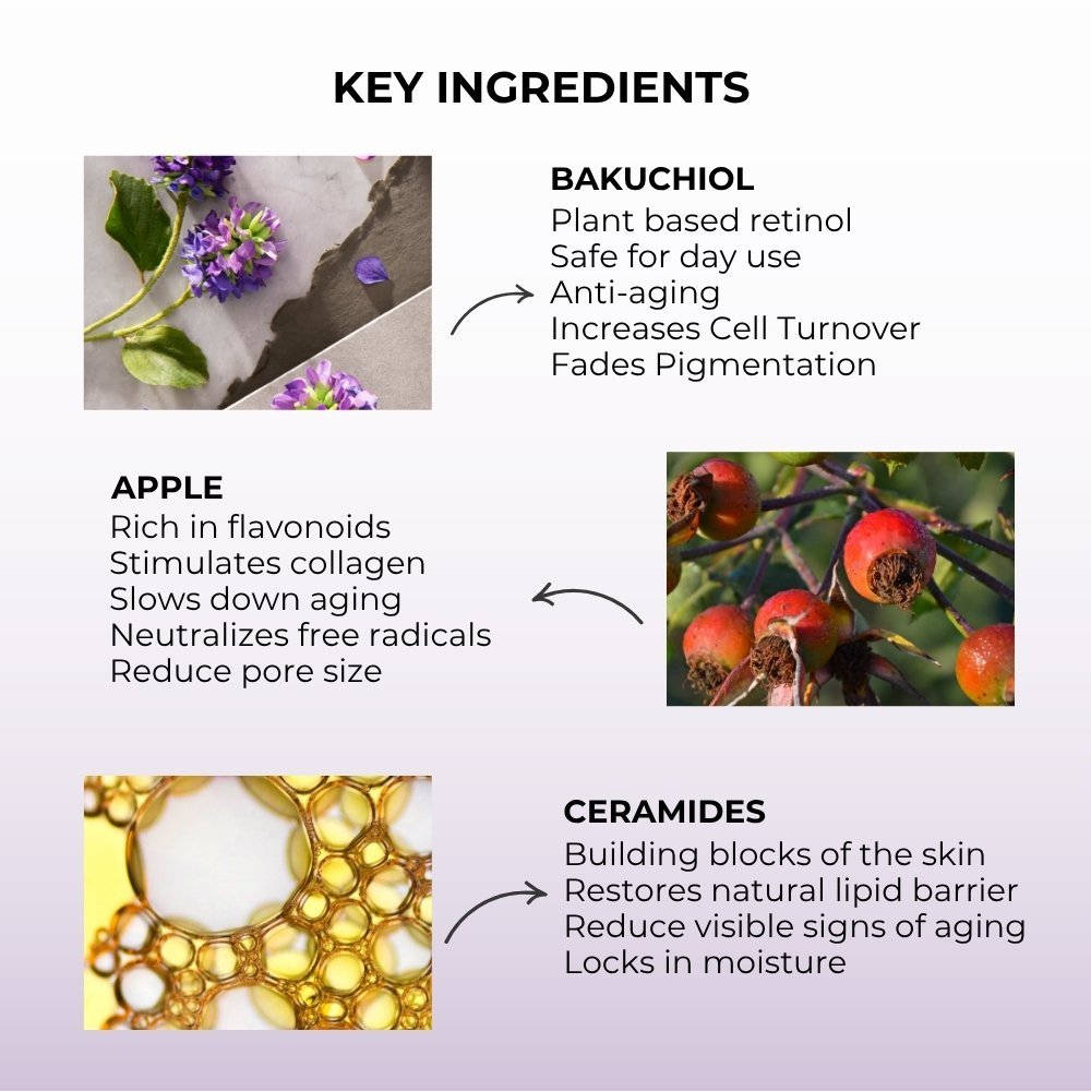 Enriched with a rare blend of bakuchiol, apple and ceramides our Age Defying Night Cream works wonders as you sleep. Bakuchiol’s nourishing factors smoothen fine lines, wrinkles and reverse oxidative damage. Apple have natural exfoliating factors that promote even complexion while ceramides help restore and retain the skin’s natural lipid barrier for firm, youthful and healthy skin.