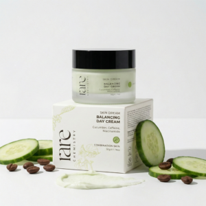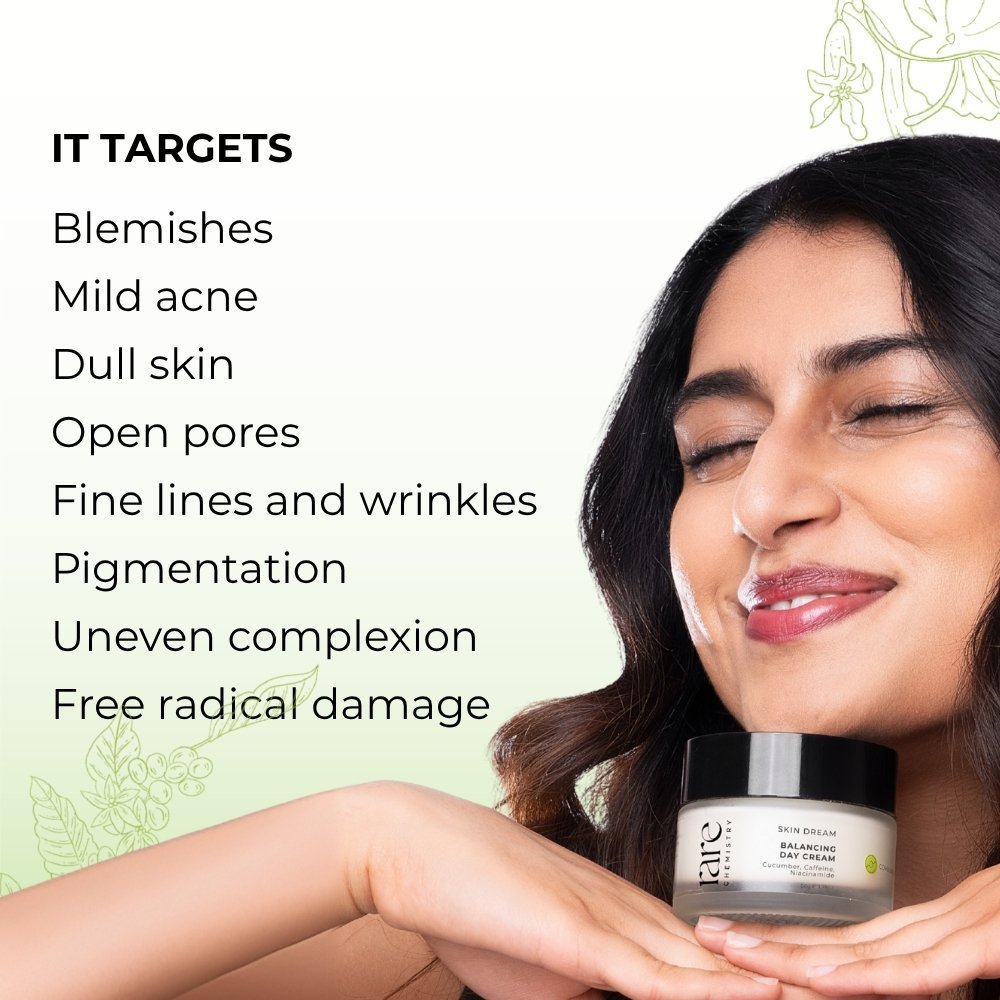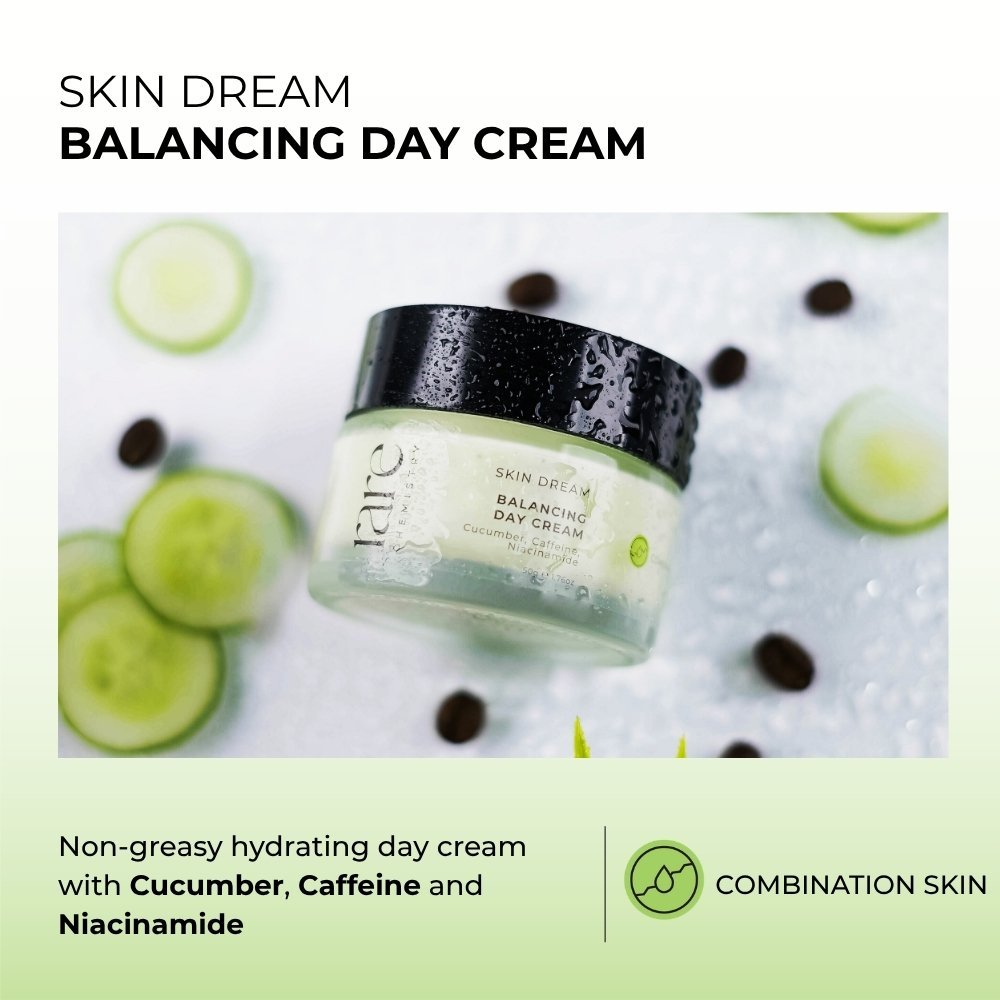Crafted meticulously with a blend of carefully sourced botanicals, our Balancing Day Cream elevates the combination skincare routine. Its lightweight texture hydrates while effectively balancing excess sebum for an even complexion. Enriched with cucumber high in vitamin C, it infuses the skin with radiance. Caffeine, with a high potency of antioxidant goodness firms and refines pore, reduces redness and combats damaging effects of free radicals. With the added power of niacinamide this cream balances skin texture for even, smooth complexion.