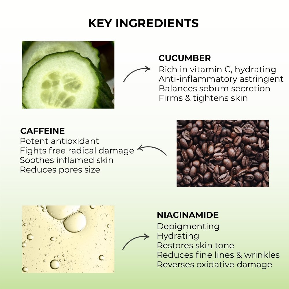 Ingredients: Cucumis sativus 1% (cucumber fresh bud oil), Coffea arabica 1% (caffeine seed powder), Persea americana 1% (avocado fruit pulp ), Hamamelis viginiana 1% (witch hazel leaf ), Psoralea corylifolia 0.25% (bakuchiol seed oil). Other Ingredients: Niacinamide, Ceramide 3, Sea buckthorn, Lactic acid serum, Aqua