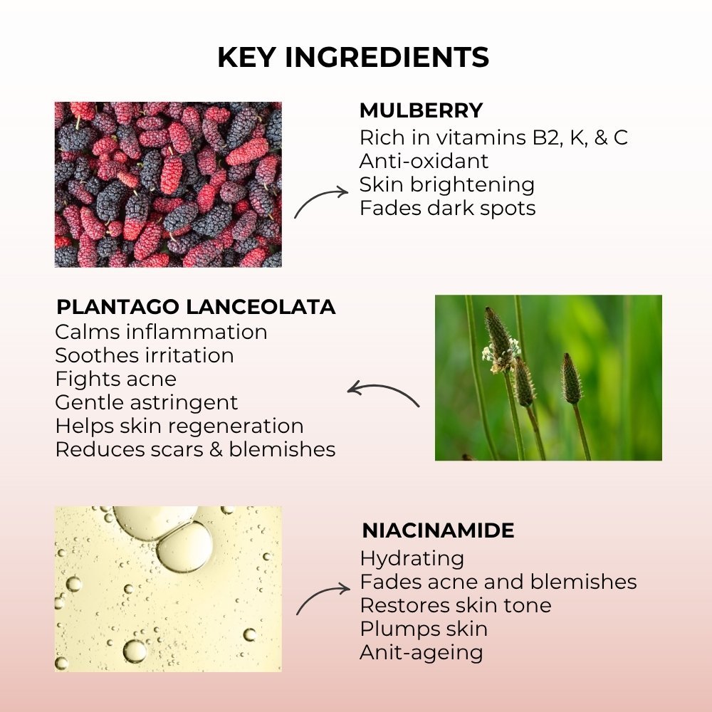 Rich in vitamins B2, K and C, mulberry is a potent antioxidant that protects the skin from environmental damage. It targets and reduces dark spots and hyperpigmentation and improves overall skin tone for healthy skin.