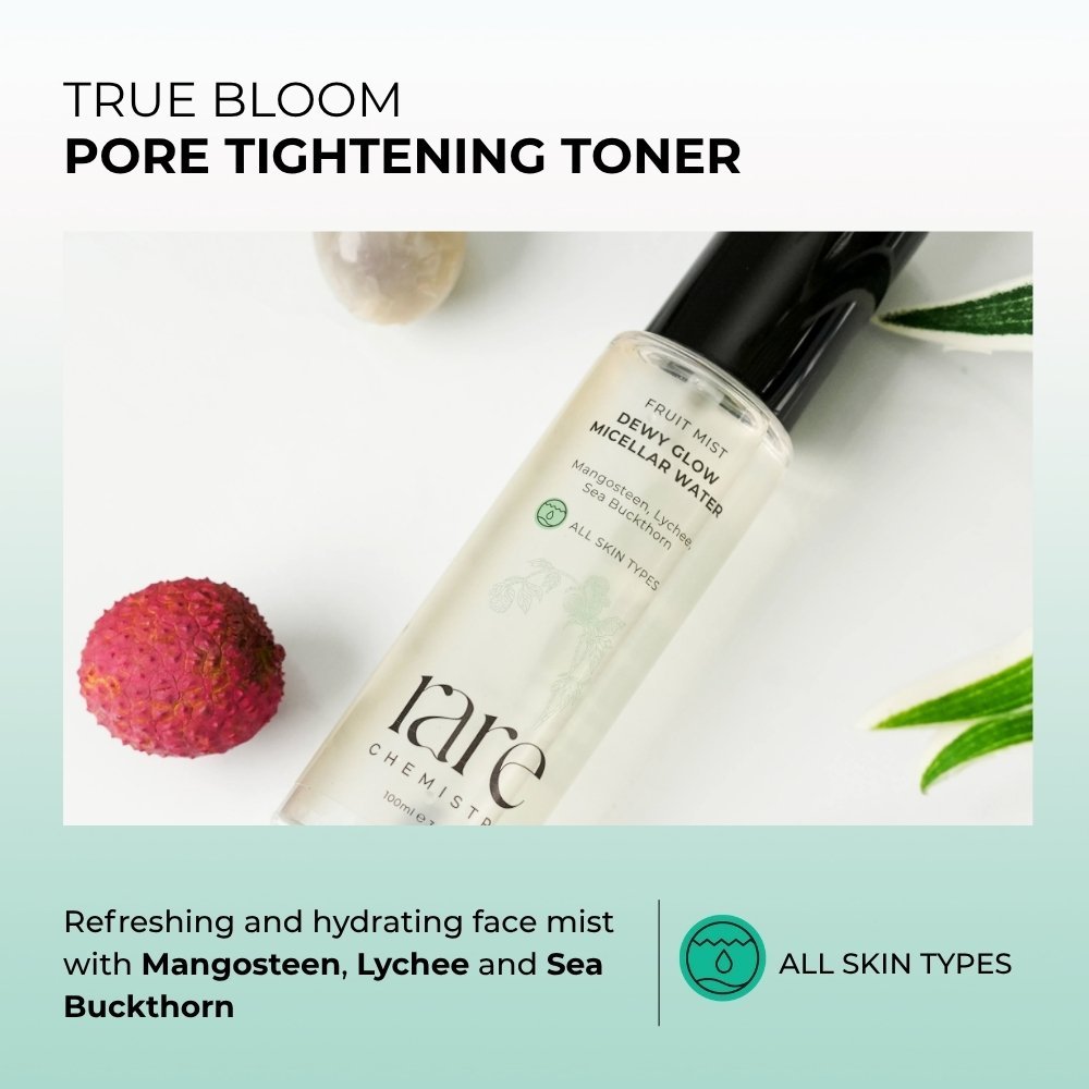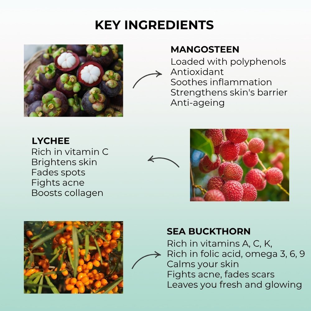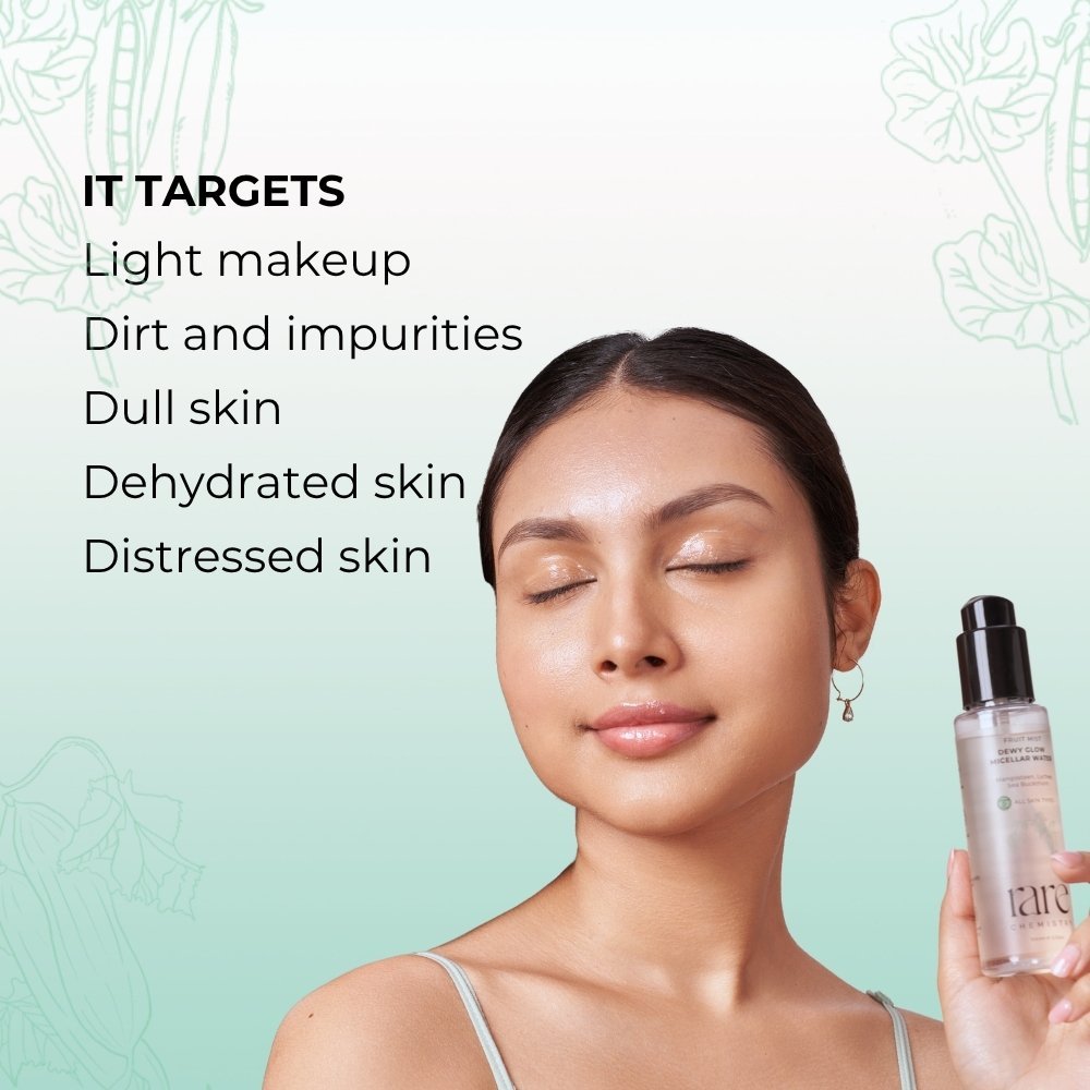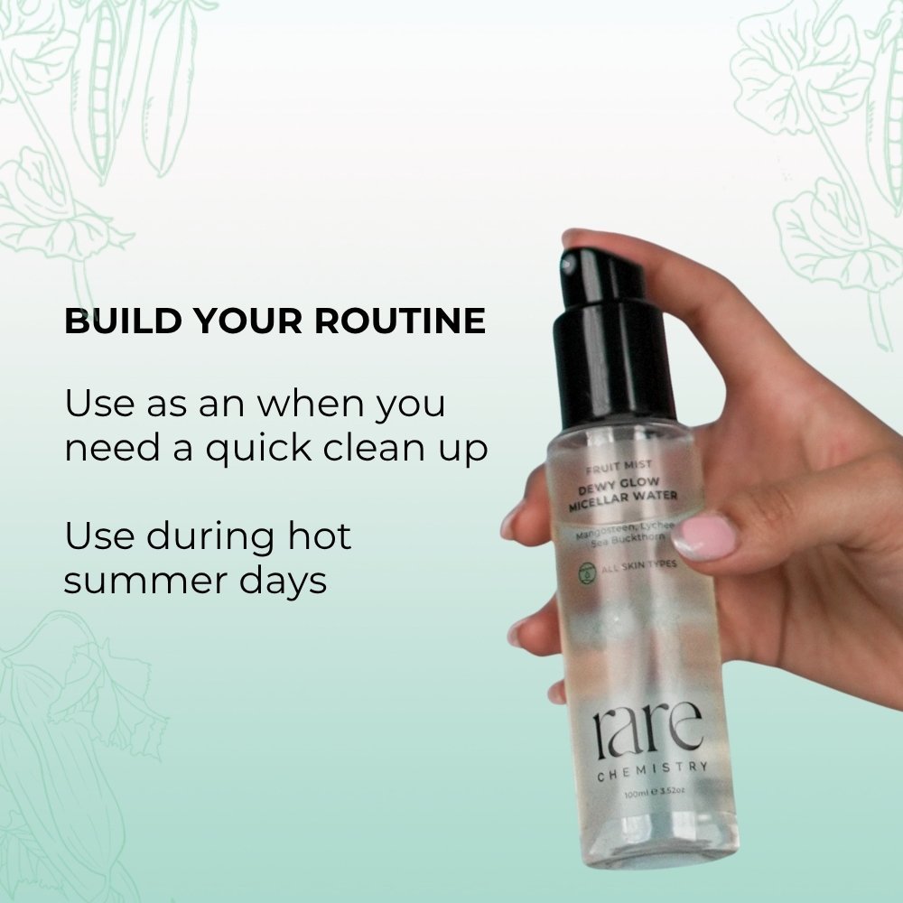 Our Dewy Glow Micellar Water is the ultimate solution for quick and hassle free cleansing. Its antioxidant rich formula with mangosteen, lychee and sea buckthorn, hydrates and removes light makeup while instantly adding a dewy glow to the face, Regular use promotes collagen production, reduces breakouts and shields from oxidative damage leaving you with radiant, even-toned complexion.