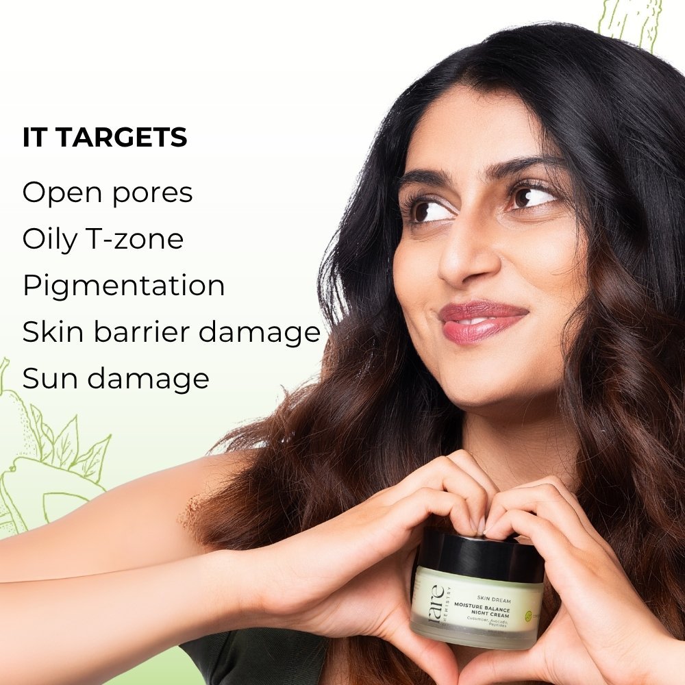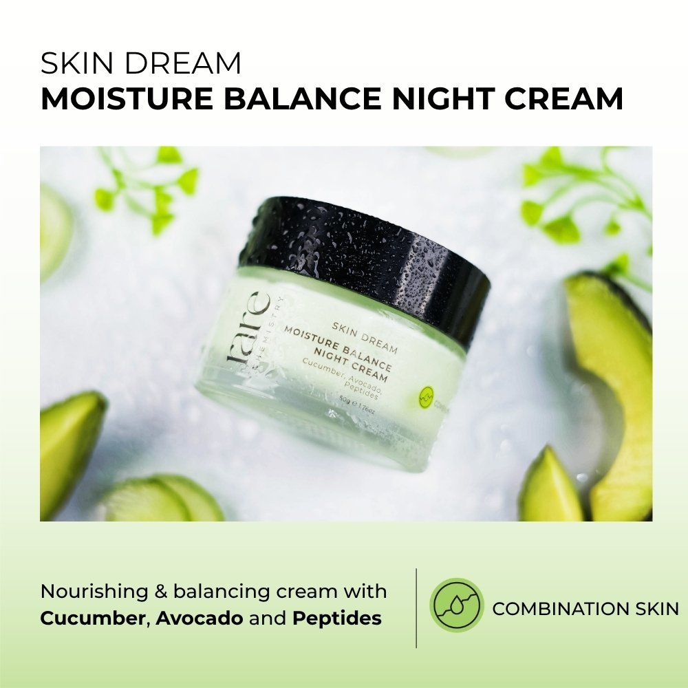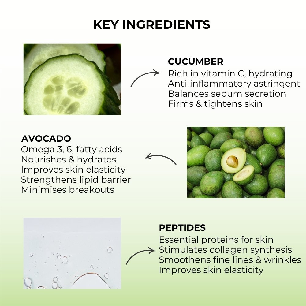 Wake up to balanced, rejuvenated skin with our Moisture Balance Night Cream. This refreshing combination of cucumber, avocado and peptide brightens, hydrates and strengthens your skin. Cucumber calms redness, regulates sebum production and tackles acne while avocado helps with pore tightening. Peptides delay the onset of fine lines, giving you a dewy and healthy complexion.
