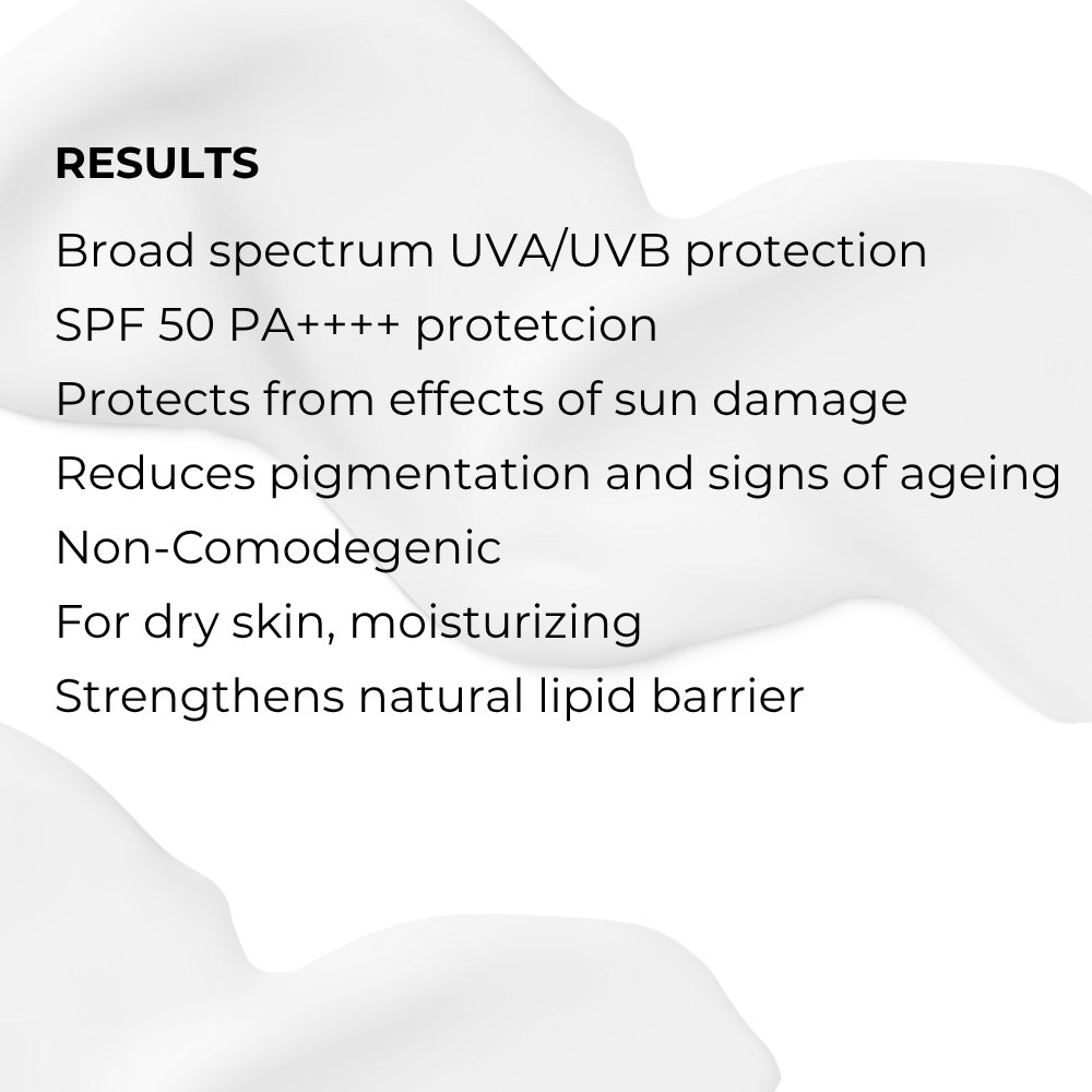 1. Broad spectrum UVA and UVB sunscreen with SPF 50 infused with natural moisturizers to prevent premature photoaging.