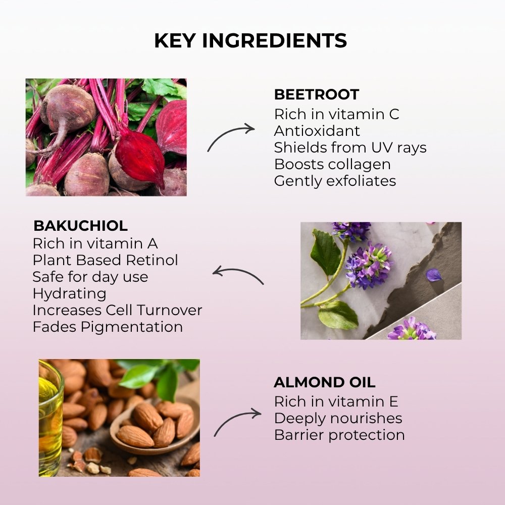 Ingredients: Prunus amygdalin 12% (almond seed oil), Helianthus annus 10% (sunflower oil), Cocos nuceifers 6% (coconut fresh bud oil), Beta vulgaris 3% (beetroot), Cucumis sativus 2% (cucumber fruit), Psoralea corylifolia 1% (bakuchiol seed oil), Helianthus annus 0.25% (sunflower wax). Other Ingredients: Potassium hydroxide, Cinnamate, Aqua