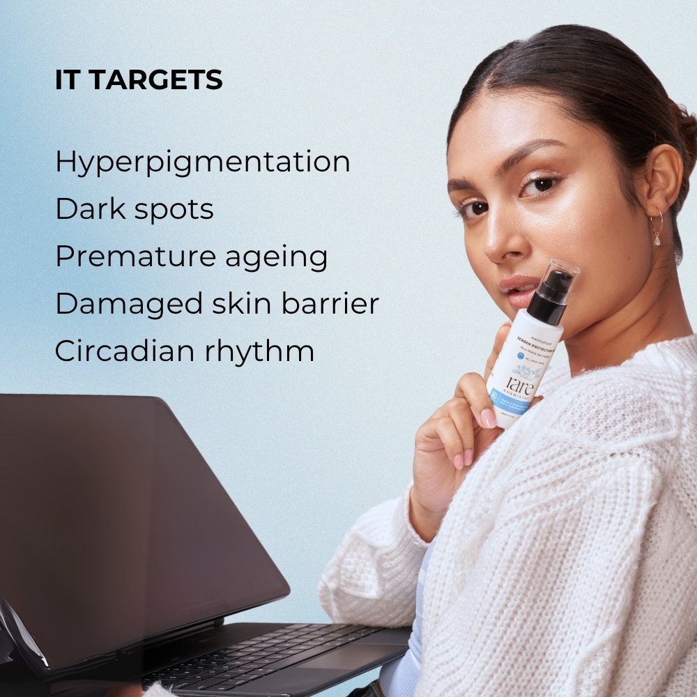 Over exposure to blue light radiation indoors not only damages the eyes but also accelerates skin ageing. It negatively impacts photoreceptors in our skin called opsins, causing disruption of the circadian rhythm (sleep wake cycle), directly affecting our overall health. Blue light rays penetrate the skin causing oxidative damage and collagen breakdown. Hyper-pigmentation, fine lines, wrinkles and dull skin are the most visible consequences of premature blue light induced photo-ageing.
