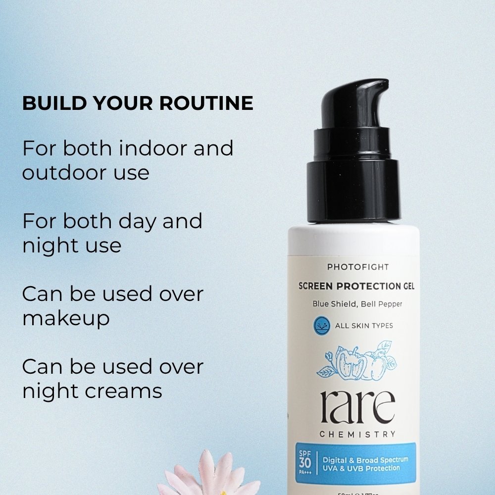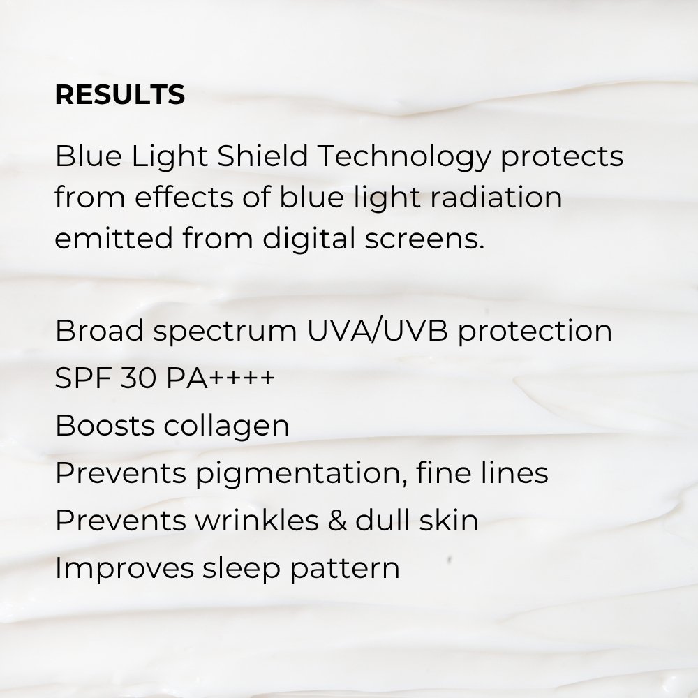 Formulated with red bell pepper, a potent combination of vitamin C, antioxidants and carotenoids, along with cucumber, green tea extract, and ceramides, it not only sheilds from blue rays induced oxidative damage, its SPF 30 safeguards your skin from UV light exposure too, making it the ideal dual sunscreen for both indoor and outdoor use.