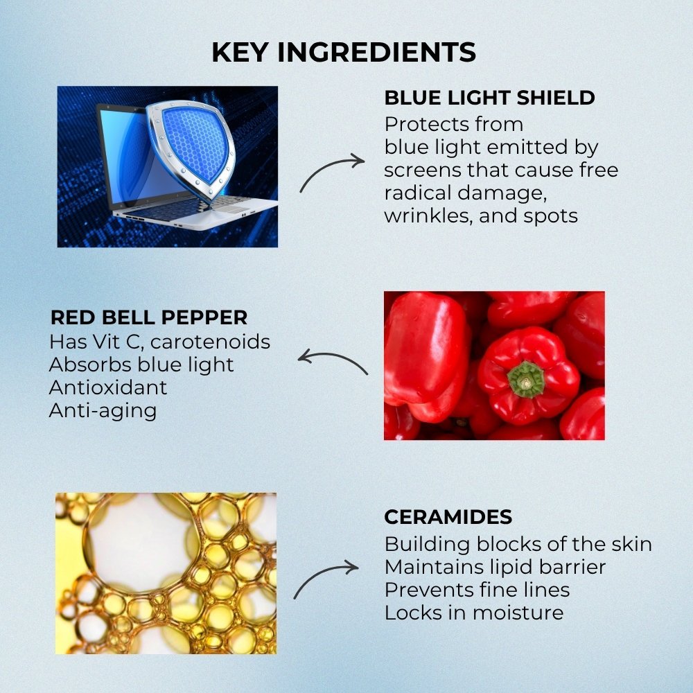 Protects the skin from blue light emitted from screens and UV radiation, that cause free radical damage, wrinkles, and hyperpigmentation. Additionally, it also stimulates collagen production and repair contributing to firmer, healthier skin.